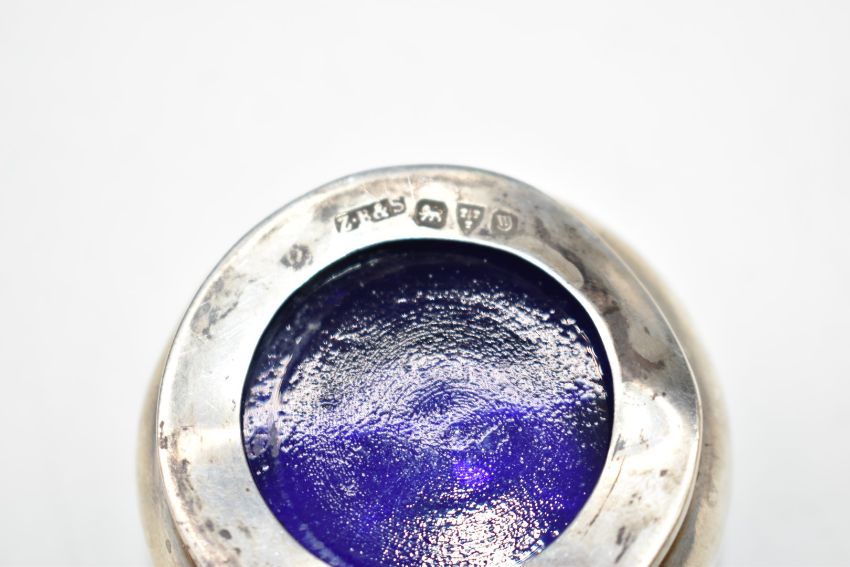 Hallmarked silver items comprising embossed pin dish, salt, mustard and pepper set with blue glass liners and two napkin rings, weight without liners 179g