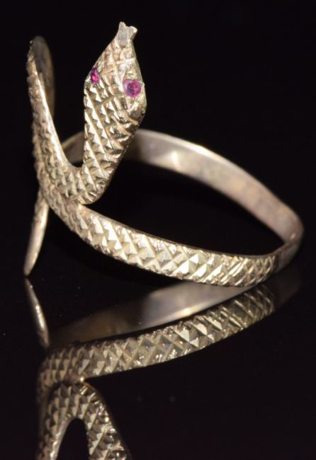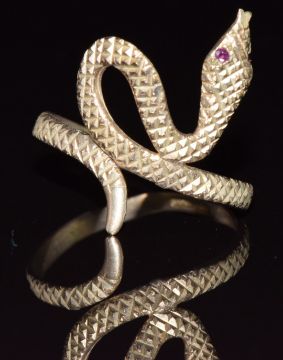 A 9ct gold ring in the form of a snake with ruby eyes, 2.6g