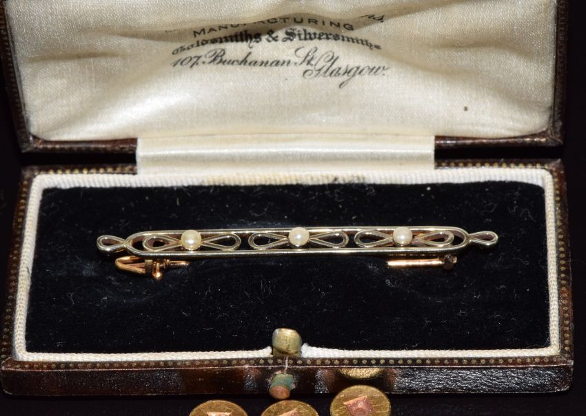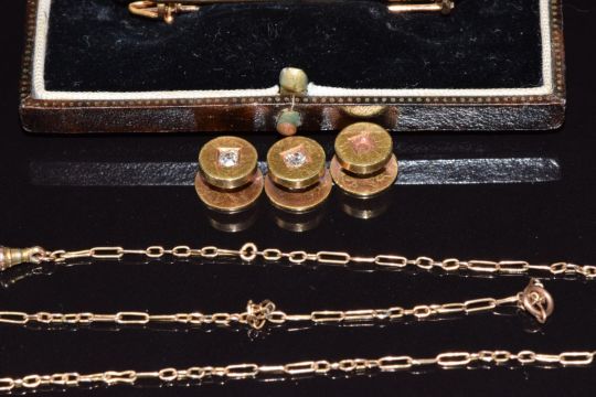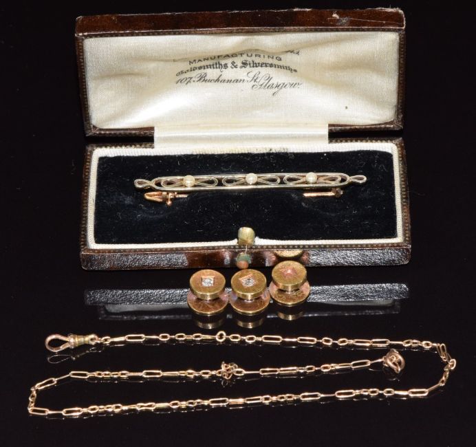 Three 18ct gold studs, two set with diamonds (4.1g), a 9ct gold brooch set with three pearls in vintage box and a 9ct gold fob chain, 4.1g