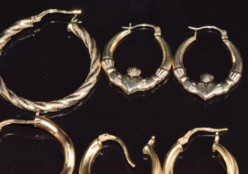 Four pairs of 9ct gold hoop earrings (6.4g) and a pair of silver gilt earrings