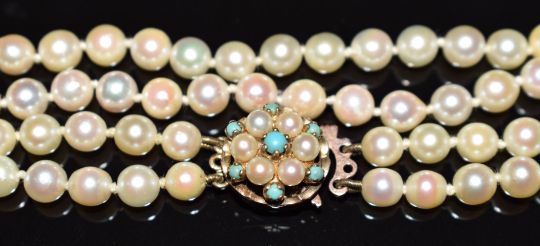 A double strand of cultured pearls, the 9ct gold clasp set with pearls and turquoise, 48.4g