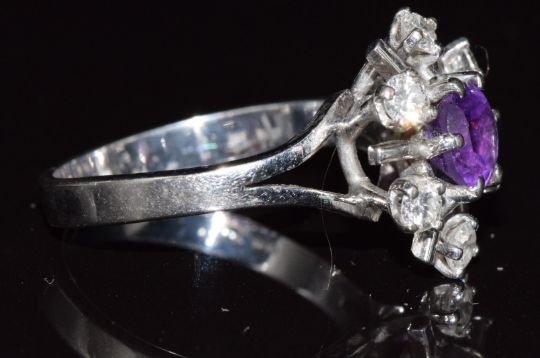 An 18ct white gold ring set with an amethyst and diamonds totalling approximately 0.48ct, 5.6g, size P