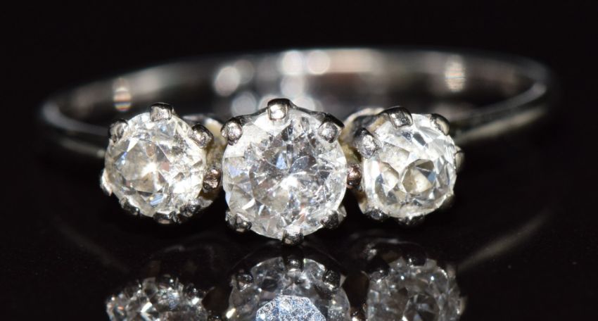 A c1915 platinum / 18ct white gold ring set with three diamonds, the largest approximately 0.28ct, 1.7g, size L