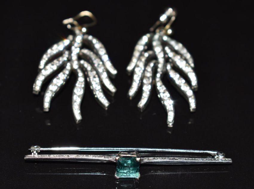Art Deco necklace and bracelet by 'Esha Randel' set with rhinestone, similar pair of earrings, Art Deco brooch, two single earrings and an Art Deco necklace