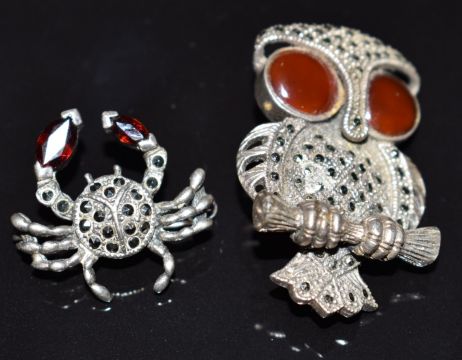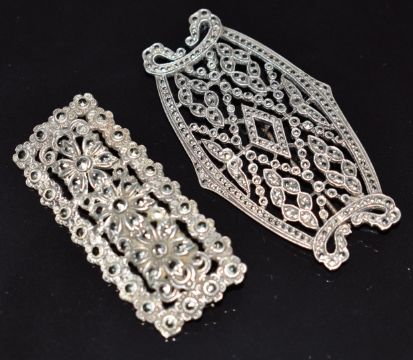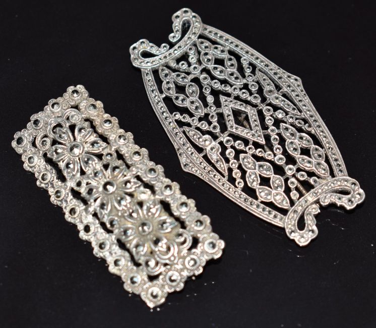 Twenty silver brooches set with marcasite including a crown, heart, lady walking her dog, bow, foliate, a Platinin brooch set with marcasite and other marcasite brooches