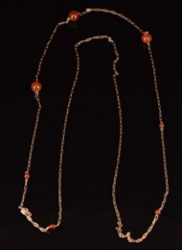A yellow metal necklace made up of fancy links set with agate beads, 6.3g, 52cm long