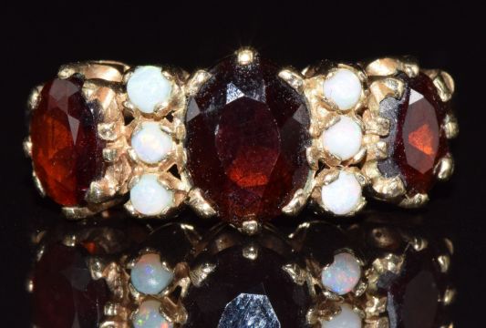 A 9ct gold ring set with garnets and opals, 3.4g, size P