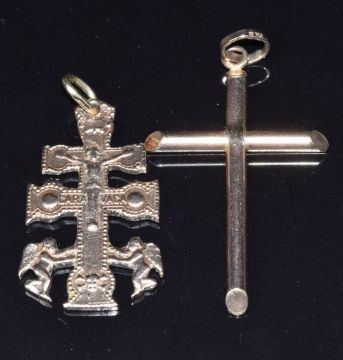 A 9ct rose gold cross (2.5g) and a yellow metal caravaca cross