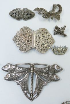A collection of brooches including vintage examples, white metal, Art Deco, Sphinx, marcasite, ceramic, sunstone, enamel heart, etc