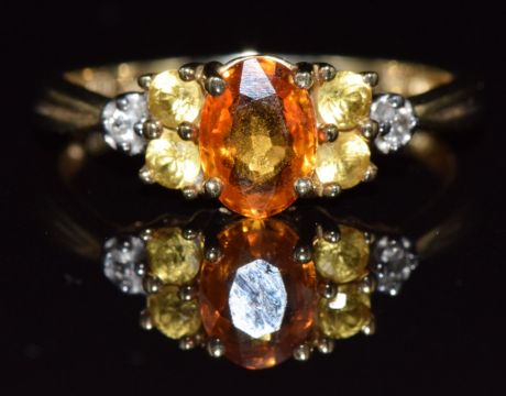 A 9ct gold ring set with an orange sapphire, topaz and diamonds, 1.8g, size N