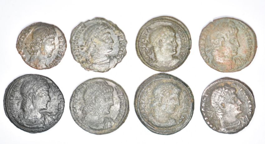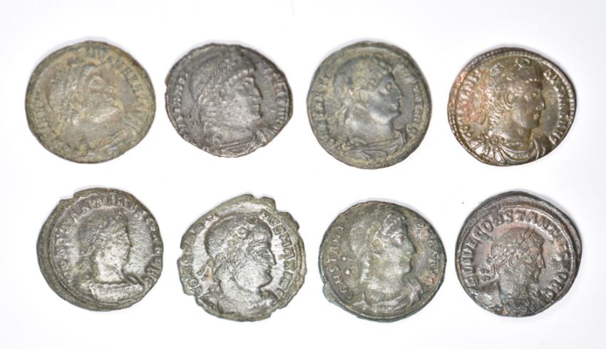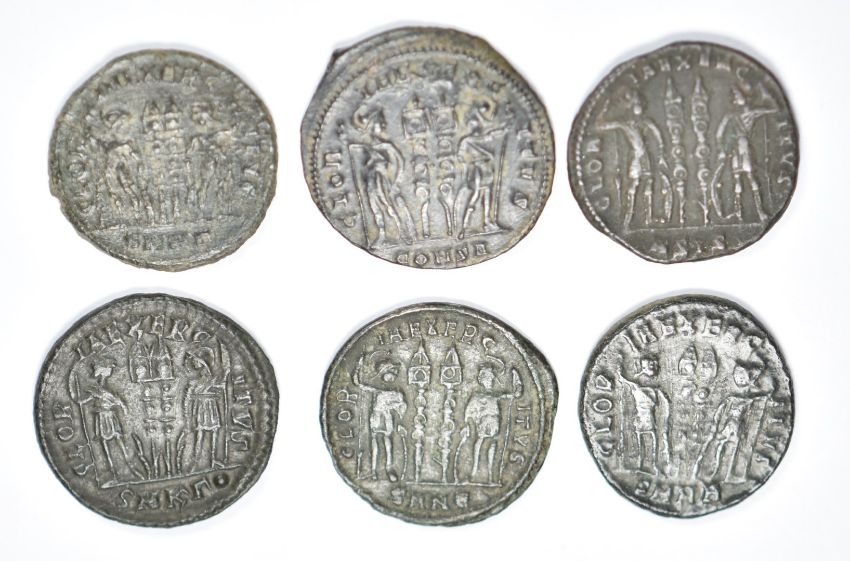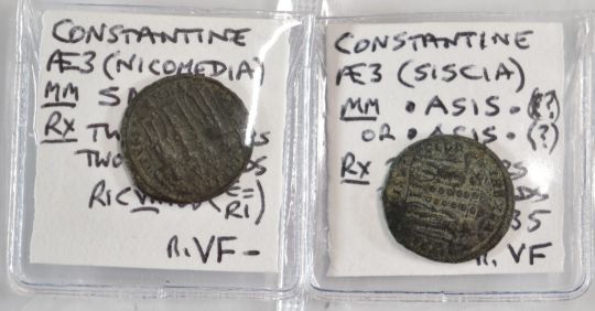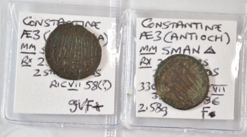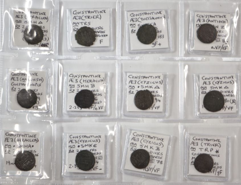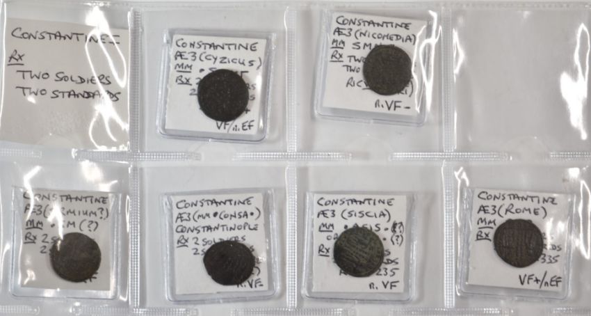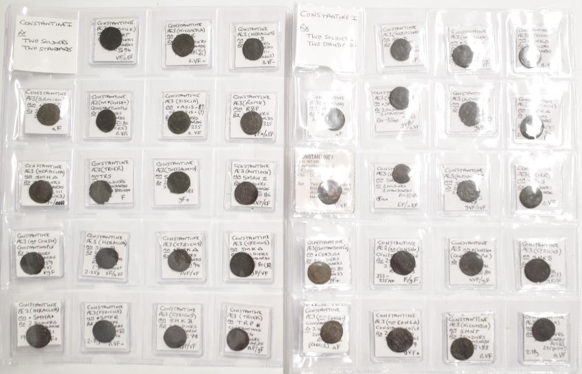 Roman Imperial, Constantine, 38 AE3 bronze coins, two soldiers, two standards, reverses