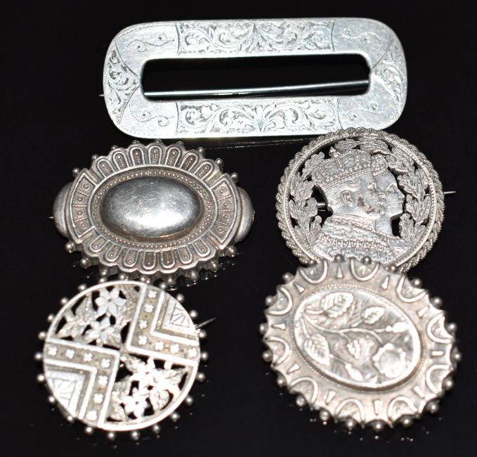 A collection of Victorian silver brooches including acorn, knot, thistle, applied gold (Birmingham 1888 & Birmingham 1891), buckle shaped (Chester 1897), etc