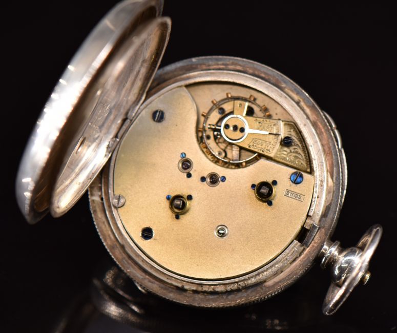 Unnamed silver open faced centre seconds chronograph pocket watch with silver hours and minutes hands, blued centre seconds hand, black Roman numerals, white dial and engraved movement, case diameter 60mm, serial number 90480.