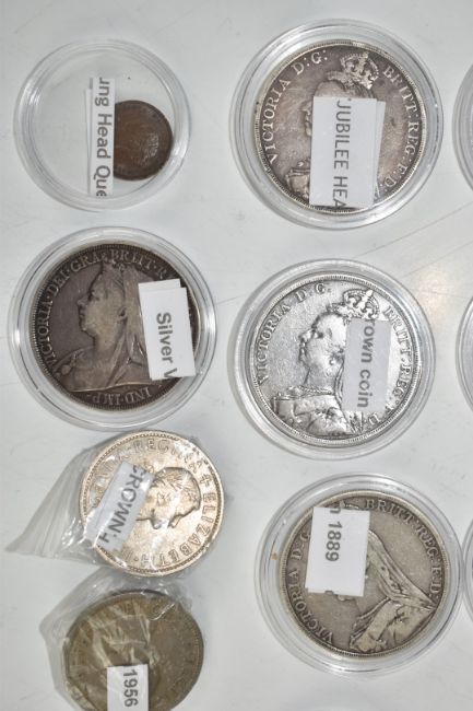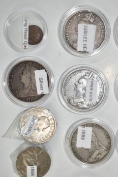 A collection of Queen Victoria silver crowns to include eight 1889 Jubilee head, two further examples for 1887 and 1890, an 1897 veiled head, two double florins 1887 and 1889, an 1844 copper half farthing and a William IV fourpence etc, 17 coins in total
