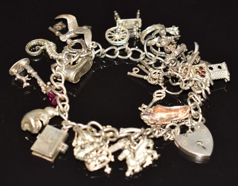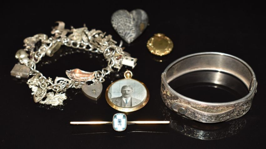 A 9ct gold locket pendant (Birmingham 1912), silver bangle with engraved foliate decoration, silver charm bracelet with eighteen silver charms, 9ct gold bar brooch (2.5g), and a Victorian locket