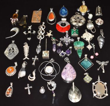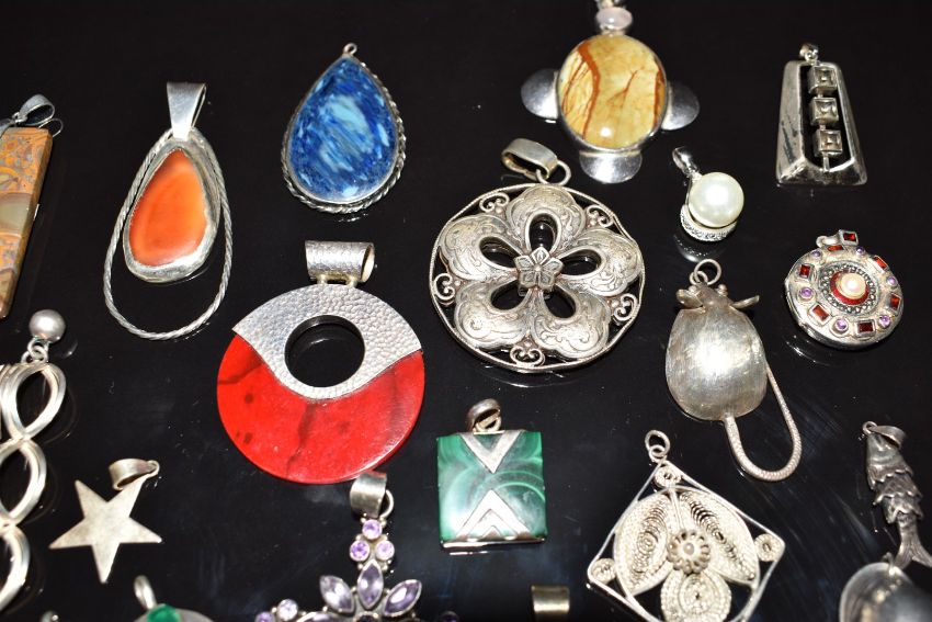 Forty silver pendants including amethyst, peridot, malachite, etc