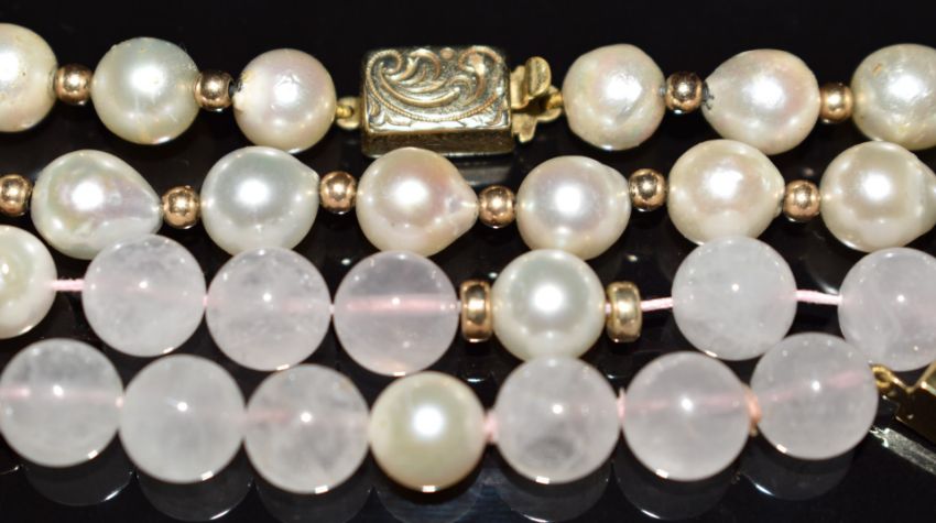 A rose quartz, pearl and gold beaded necklace with 9ct gold clasp and a pearl and silver gilt necklace