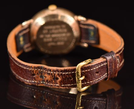Smiths Everest 9ct gold gentleman's automatic wristwatch with gold dauphine hands, hour markers and Arabic numerals, silver dial and 25 jewel movement, on brown leather strap, case diameter 34mm