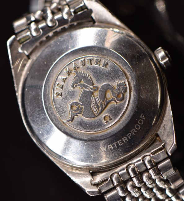 Omega Seamaster gentleman's automatic wristwatch ref. 2975 with luminous gold hands, gold hour markers, silver dial, stainless steel case and signed calibre 501 movement, on stainless steel bracelet, case diameter 35mm, serial number 16559966.