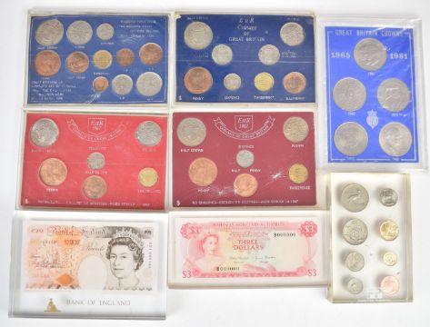 A collection of coin sets in perspex presentation packs and blocks, includes banknote examples
