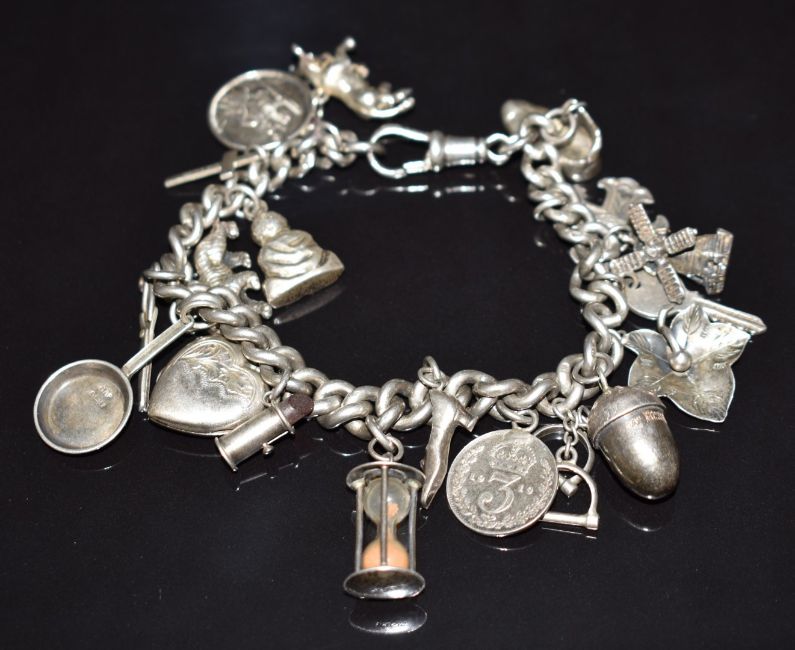 A silver charm bracelet with 19 silver charms including St Christopher, bull, windmill, acorn, lipstick, heart locket, miniature hourglass, etc, 63.9g