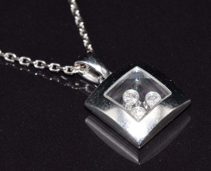Chopard 'Happy Diamond' necklace, the square glazed compartment containing three collet-set brilliant cut diamonds, on 18ct white gold chain by Chopard, 9.3g