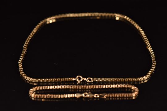 A 9ct gold chain and matching bracelet made up of rectangular box links, 17.7g, 38cm and 18cm long