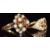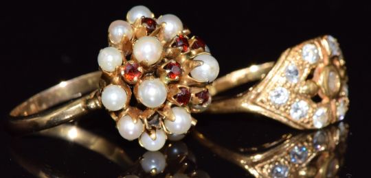 A yellow metal ring marked 21k (3.8g, size O) and a yellow metal ring set with pearls and garnets, 5g, size L