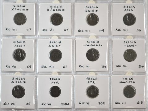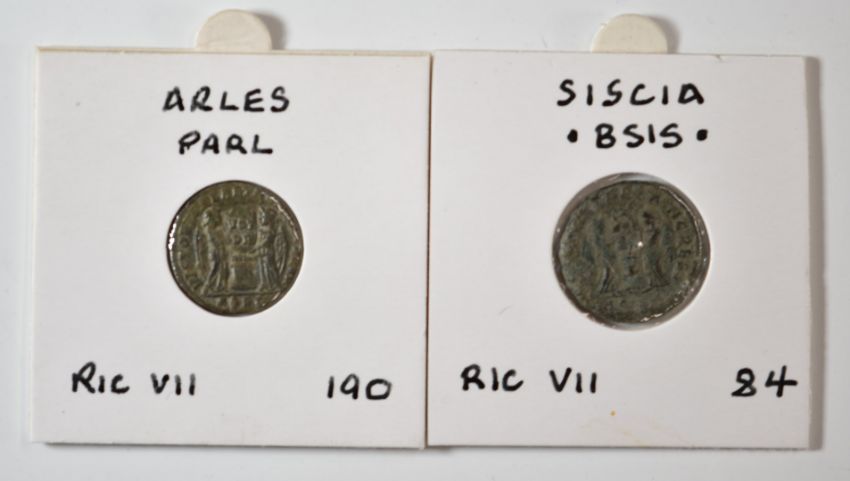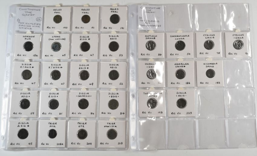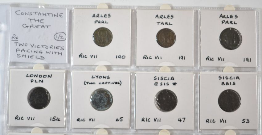 Roman Imperial, Constantine, 28 AE bronze coins, two soldiers, two standards, two victories facing with shield reverses