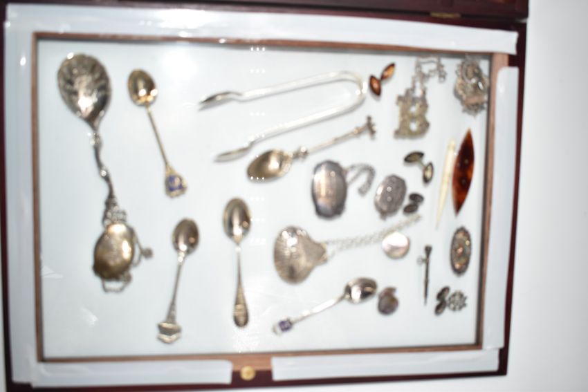 Hallmarked silver continental and American silver spoons, napkin ring marked silver, hallmarked silver sugar tongs and three hallmarked silver bottle labels or tickets, weight of silver 194g, further collectable spoons, pencils and pens, brooches etc