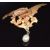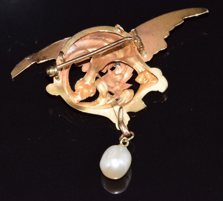 A 19thC yellow metal pendant/ brooch in the form of a phoenix set with two pearls and a drop pearl pendant, 8.4g, 6 x 3.5cm