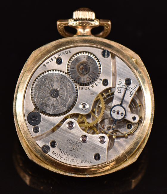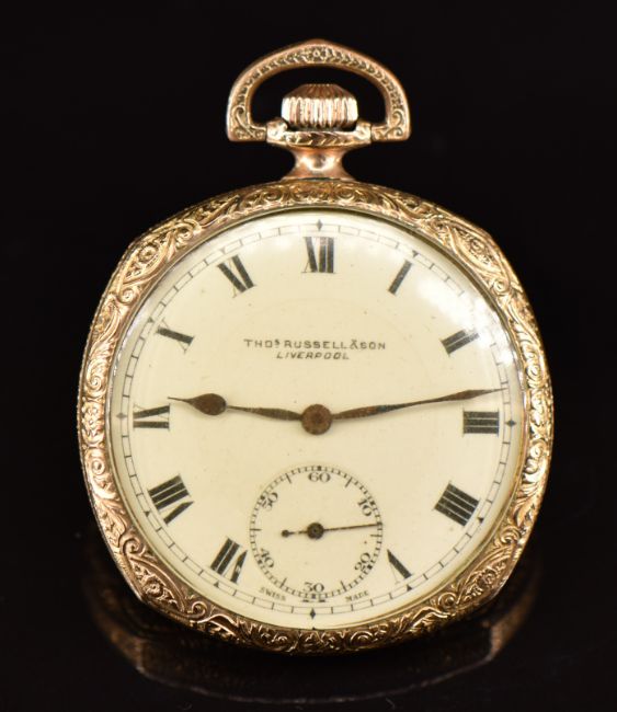 Thomas Russell & Son gold plated keyless winding open faced pocket watch with inset subsidiary seconds dial, blued hands, black Roman numerals, white enamel dial, engraved case and signed and engraved movement, case diameter 43mm, serial number 7451577.