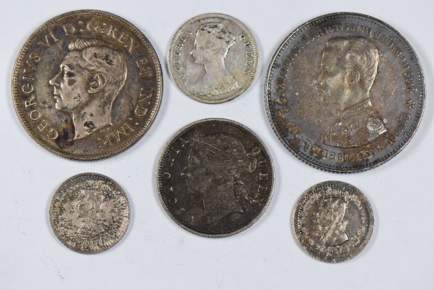 Thailand Rama V Bahat silver coin 1876-1900, together with two I Bahat examples and 1898 Queen Victoria Hong Kong 20 cents and 1901 10 cents and 1947 George VI 50 cents 'straight 7 no maple leaf'