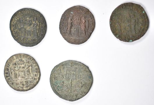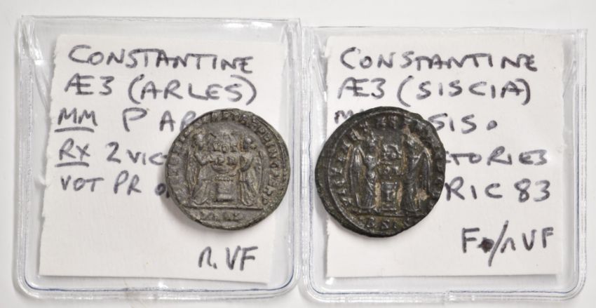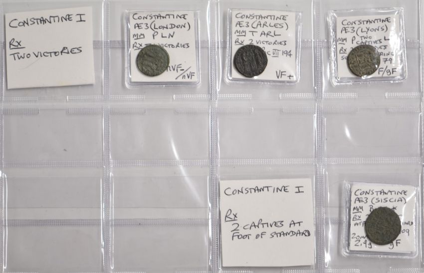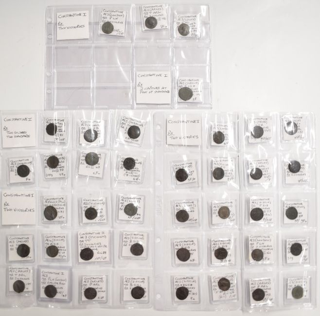 Roman Imperial, Constantine, 40 AE3 bronze coins, two Victories, two soldiers, two standards, two captives reverses