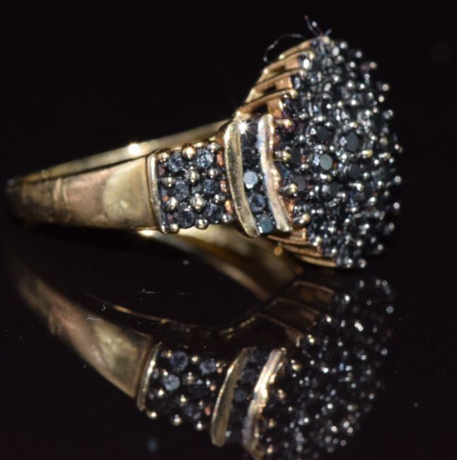 A 9ct gold ring set with approximately 1ct of black diamonds in a cluster, 4.1g, size K