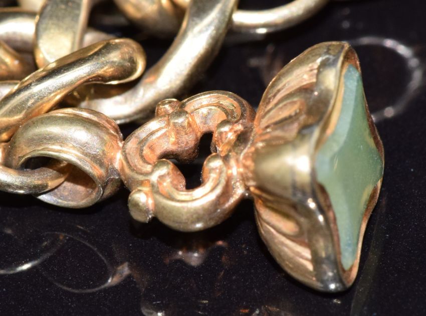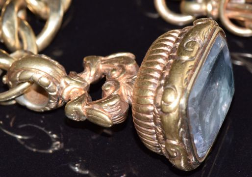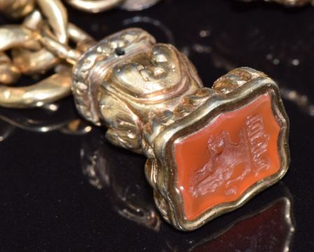 A 9ct gold bracelet with three seal fobs set with foiled quartz, agate and faux bloodstone, three intaglio seal fobs, one glass carved to depict a man, one foiled quartz carved with initials and one carnelian agate depicting a lion with initials, and a swivel fob set with agate, bracelet 20cm long