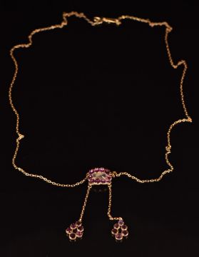 Victorian 9ct necklace set with three sections of foiled garnets, the central section set with a glass compartment, 6.8g, 63cm long