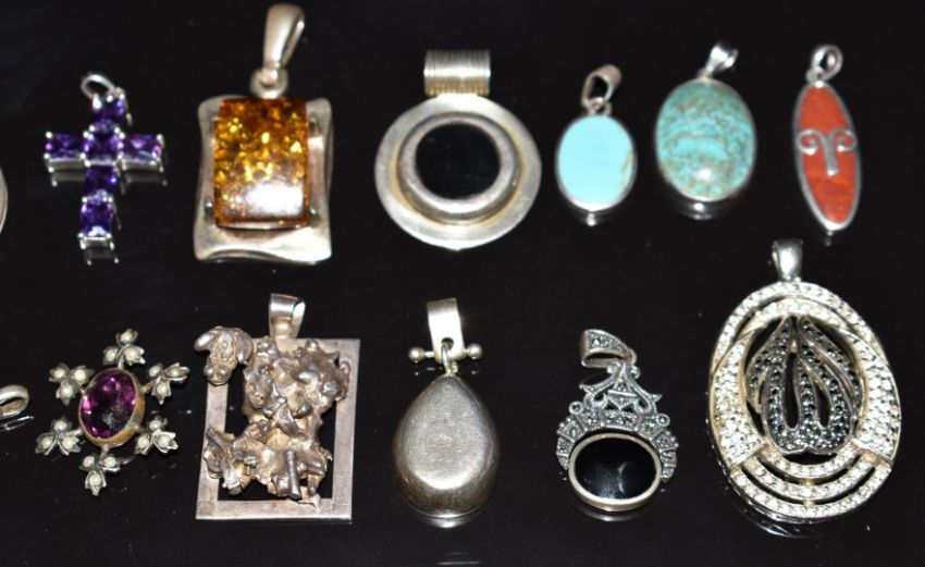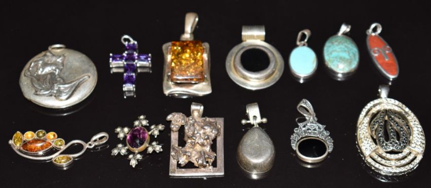 Twelve silver pendants including amber, turquoise, coral, etc