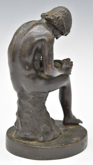 Bronze seated nude figure taking a thorn from his foot, on circular base, height 19cm