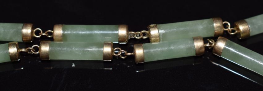 A 9ct gold chain and 9ct gold chilli pendant (2.2g) and a 9ct gold bracelet set with jadeite
