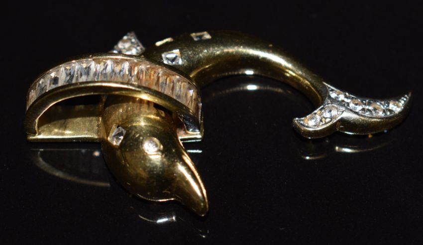 A 14k gold pendant in the form of a dolphin set with cubic zirconia, 7.9g