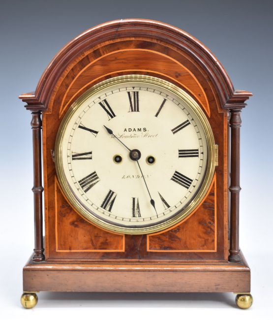 Adams, 36 Lombard Street London, Georgian 19thC twin fusee bracket or mantel clock striking on a bell, the painted dial having Roman numerals, the arch top case with inlaid and decoration, raised on ball feet, overall height 48cm