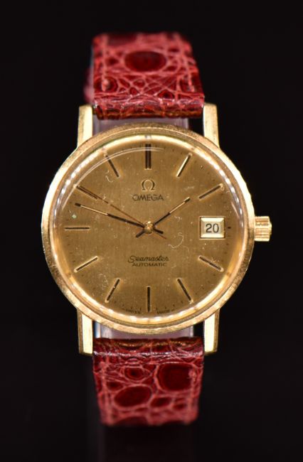 Omega Seamaster gentleman's automatic wristwatch ref. 166.0202 with date aperture, two-tone hands and baton hour markers, gold dial, gold plated case and signed 17 jewel calibre 1010 movement, on leather strap, case diameter 34mm, serial number 42427125.