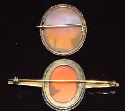 Victorian 9ct gold brooch set with a cameo and a yellow metal brooch set with a cameo, 12.1g, longest 6cm