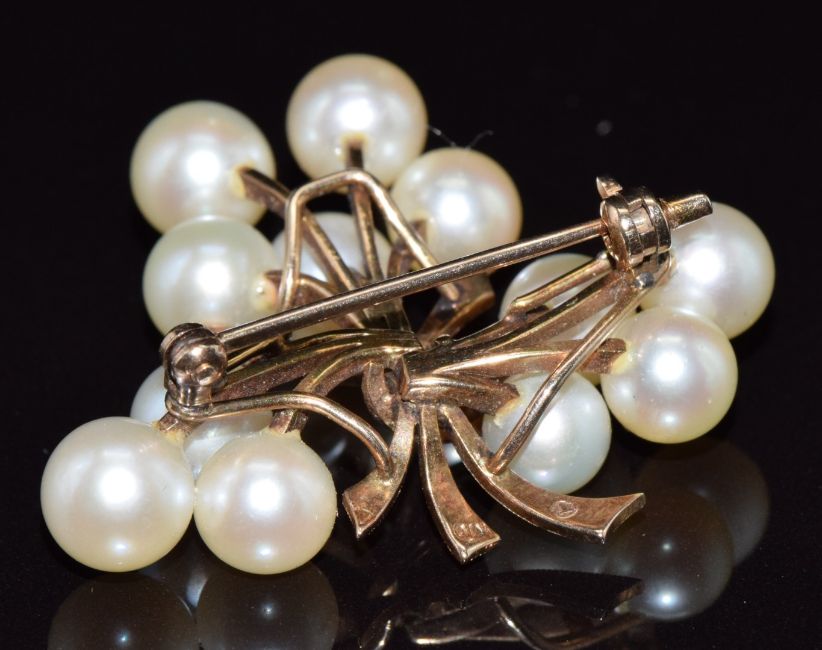A 10k gold brooch set with pearls in a stylised bouquet design, 7.5g, 3.5cm x 3cm