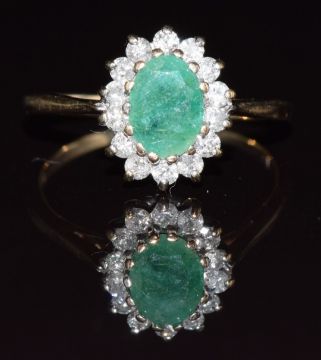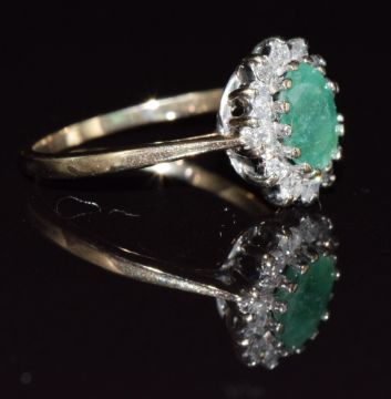 A 9ct gold ring set with an oval cut emerald surrounded by diamonds, 1.8g, size K/L