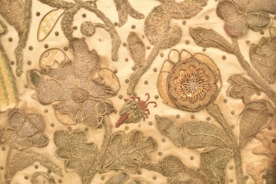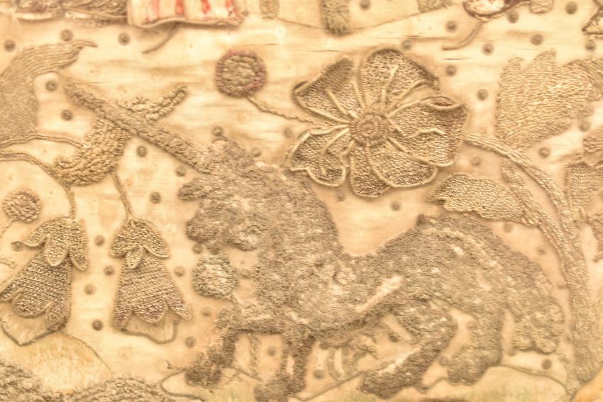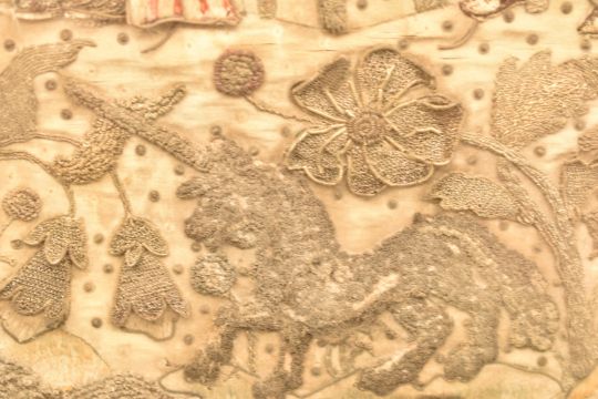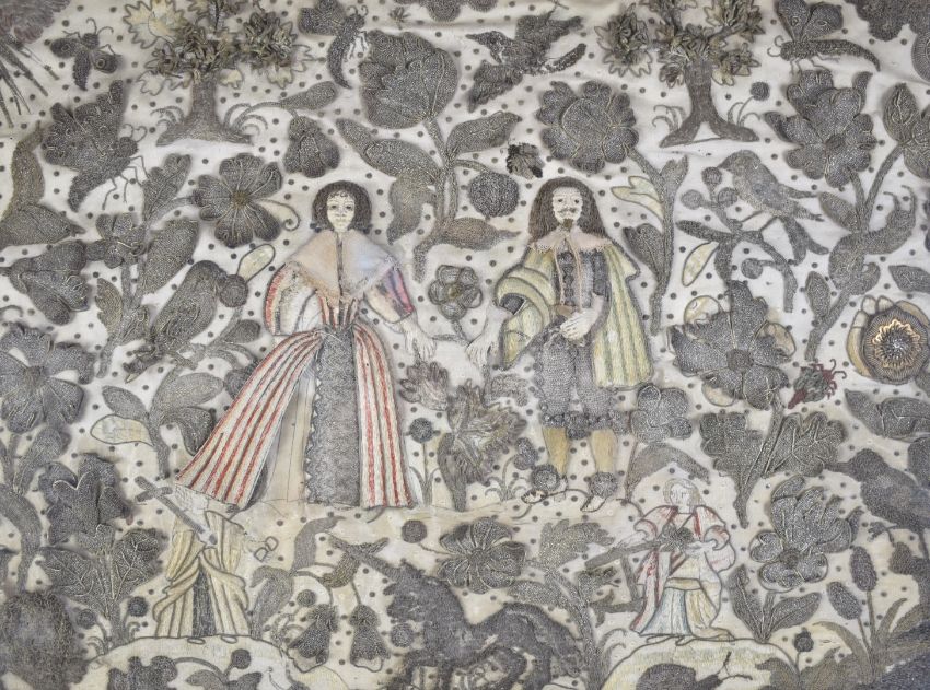 Early 17thC stumpwork and embroidery of the marriage of Charles I and Henrietta Maria (Queen Mary), their outstretched arms signifying the joining of the houses of Stuart and Bourbon, the surrounding silver and gold thread stumpwork depicting religious figures, unicorn, flora and fauna, c1625, 35 x 51cm, Provenance: In the ownership of a prominent Midlands collector and heir for more than 50 years. The vendor remembers as a very young girl accompanying her parents to purchase the stumpwork from a large house near Exeter