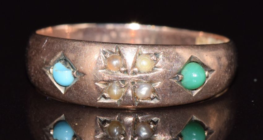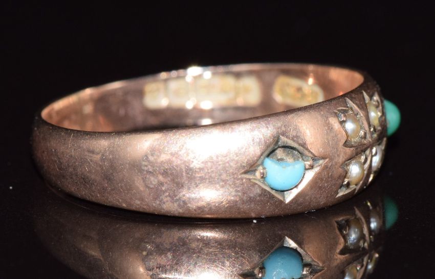 Edwardian 9ct rose gold ring set with seed pearls and turquoise, Birmingham 1901, 2.2g, size O