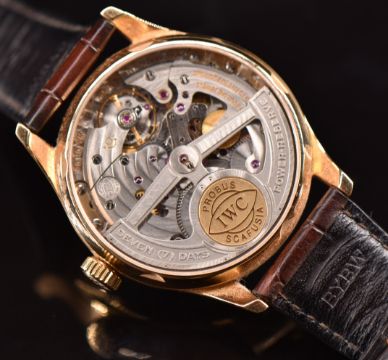 IWC Portugieser 7-Day Automatic 18ct gold gentleman's automatic wristwatch ref. IW500113 with power reserve indicator, date aperture, subsidiary seconds dial, gold hands and Arabic numerals, silver dial, clear exhibition case back and signed calibre 51011 movement, on brown crocodile leather strap, case diameter 42mm, serial number 3003629.