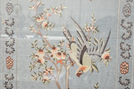 Early/mid 20thC Chinese embroidery of birds, flora and fauna, 166 x 51cm